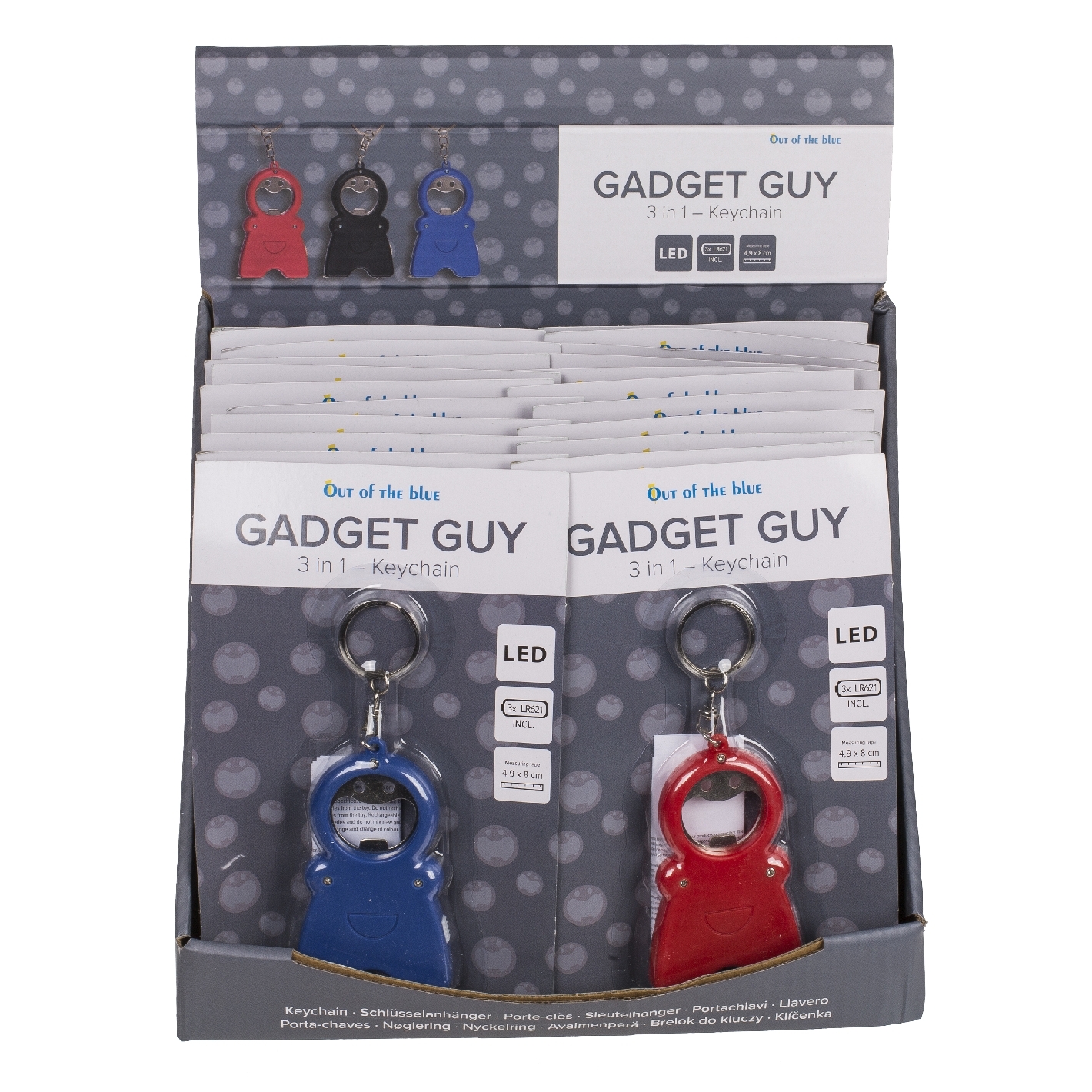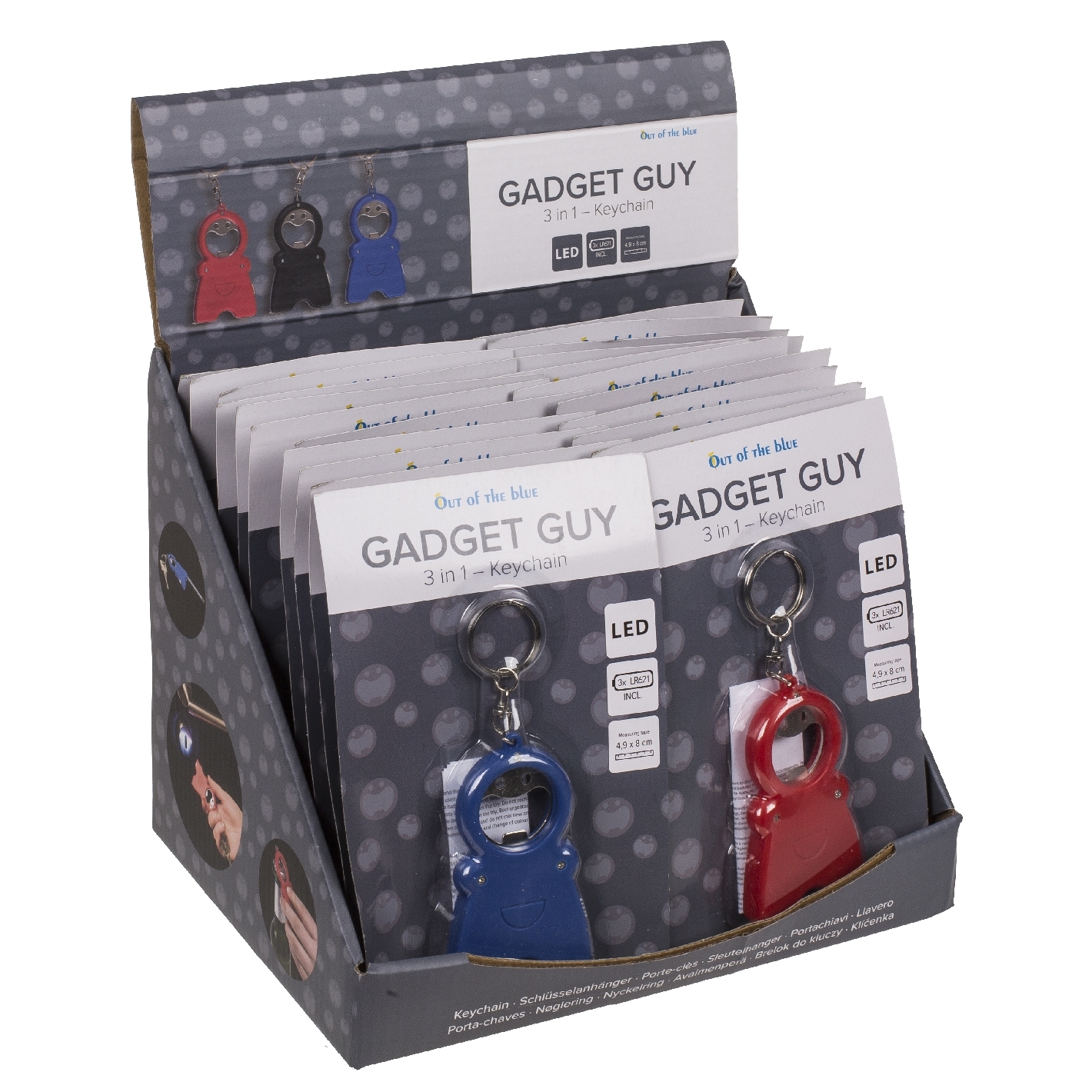 avec ouvre-bouteille, lampe de poche et ruban de mesure, environ 4,9 x 8 cm, 3 couleurs assorties, sur carte blister, 24 pièces par présentoir