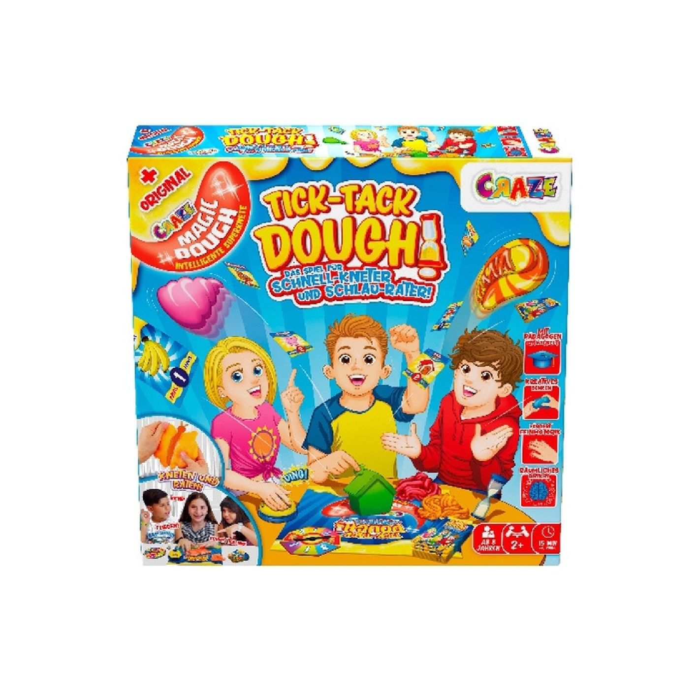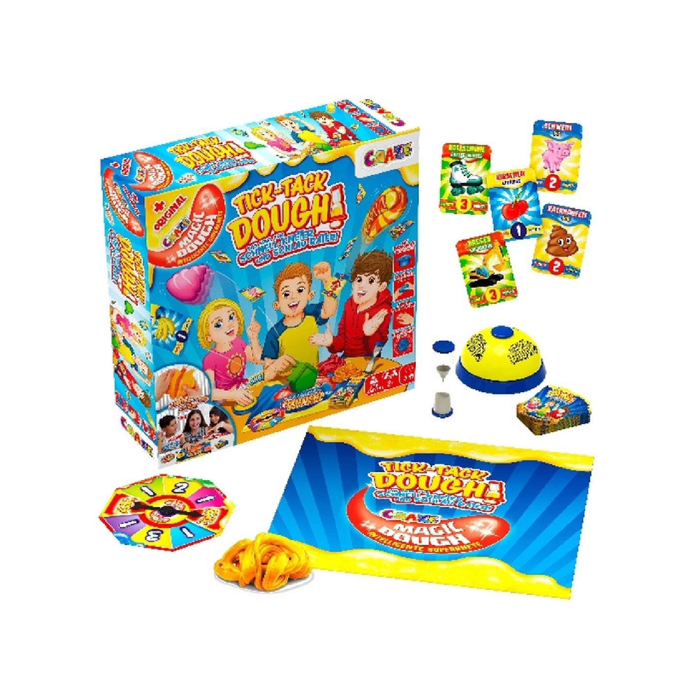 Inhalt: Magic Dough, Motivkarten, Aktionsrad, Klingel, Sanduhr, Knetunterlage und eine ausführliche Anleitung inklusive Kurzanleitung.