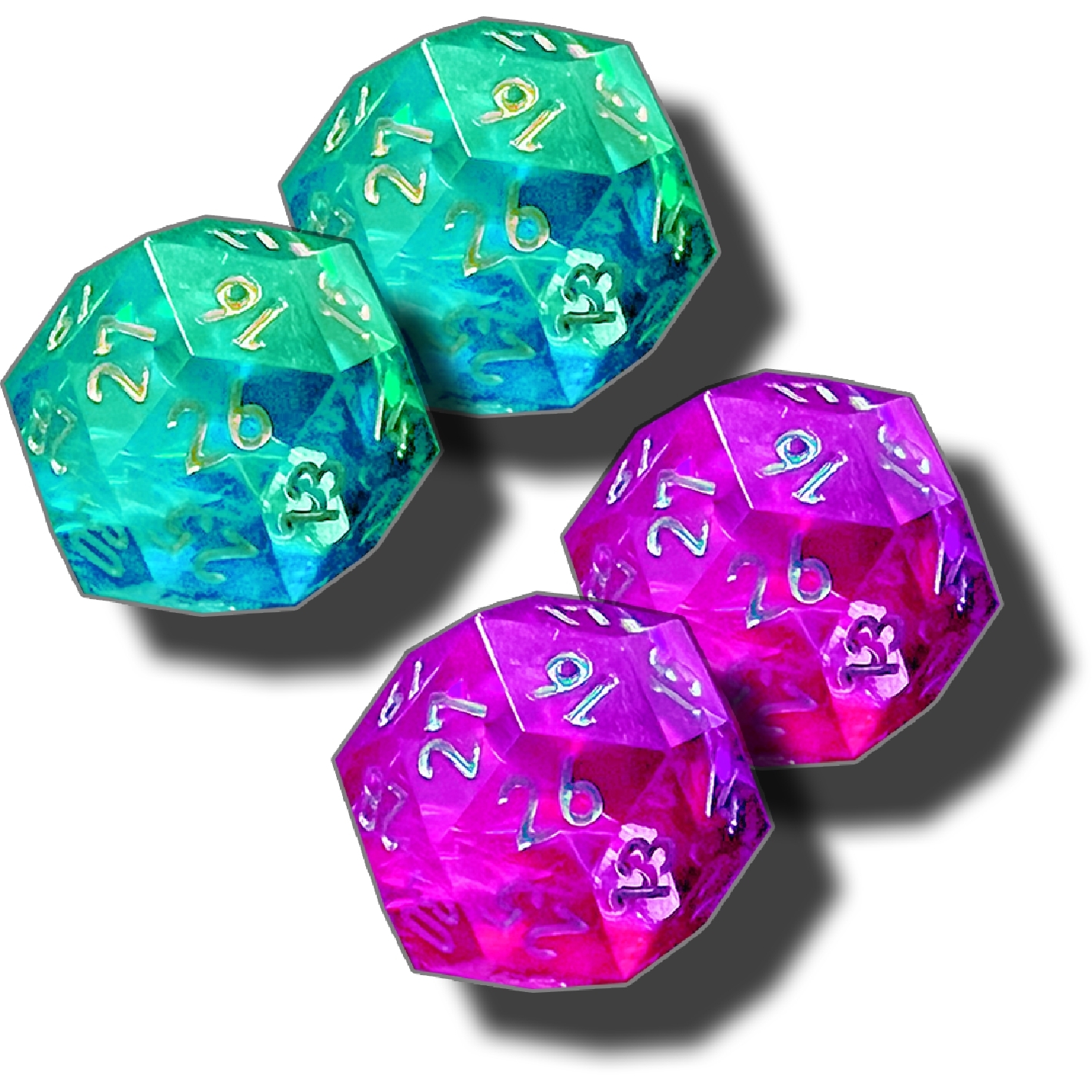 Contient 4 dés de 30 faces dans un petit sachet ( 2 verts et 2 roses )